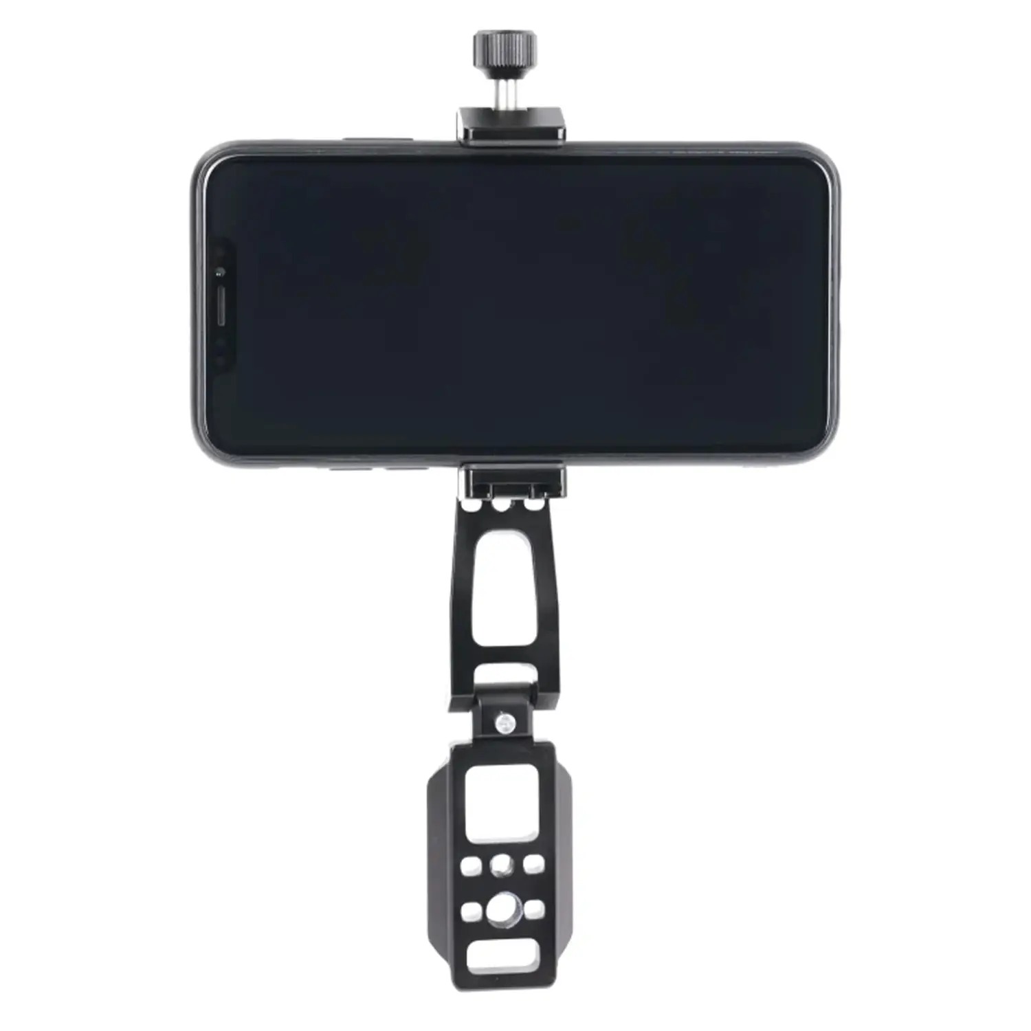 Пулевая головка позволяет вращать смартфон в крепеже на 360° и наклонять в любую сторону на 40° для установки необходимого ракурса съемки. Складные кавычки с толстыми резиновыми накладками надежно удерживают смартфон в нужном положении. Подпружиненный фиксатор фиксирует неподвижный адаптер в рабочем положении. Корпус и все узлы выполнены из алюминия и стали, что обеспечивает точность фиксации и долговечность.