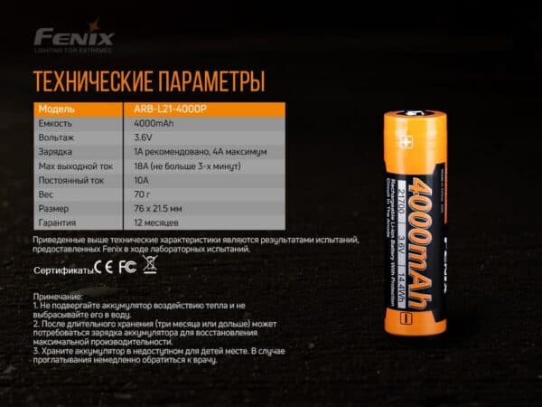 Батарейка Fenix ARB-L21-4000P выдерживает 500 циклов зарядки. Предусмотрена защита от перезаряда, а также предотвращение избыточной разрядки аккумулятора. Модель защищена от короткого замыкания, также есть защита клапана сброса давления, катодного блока. Вы не сомневаетесь в надежности данного аккумулятора.