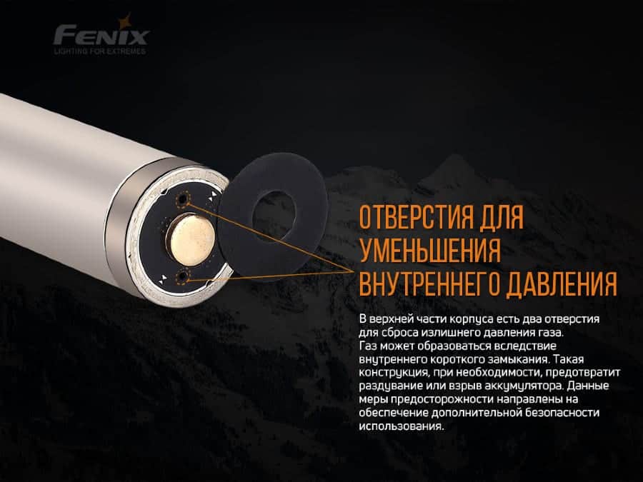 Компания Fenix продолжает пополнять ассортимент качественных фирменных аккумуляторов для своих фонарей. Модель Fenix ARB-l21-5000 сделана в формате 21700 и подходит для питания ярких ручных моделей. Это литий-ионный аккумулятор с несколькими уровнями защиты от всех наиболее распространенных факторов риска. В том числе, он не боится перезарядки и переразрядки, не подвержен переполюсовке. Кроме того, стальной корпус хорошо справляется с задачей защиты аккумулятора от ударов или деформации вследствие механического воздействия. В поверхности корпуса сделаны небольшие отверстия, через которые может выйти лишний газ, образовавшийся во время нагревания аккумулятора. Эти отверстия не видны под пленкой, обтягивающей элемент питания и защищены от попадания внутрь пыли.