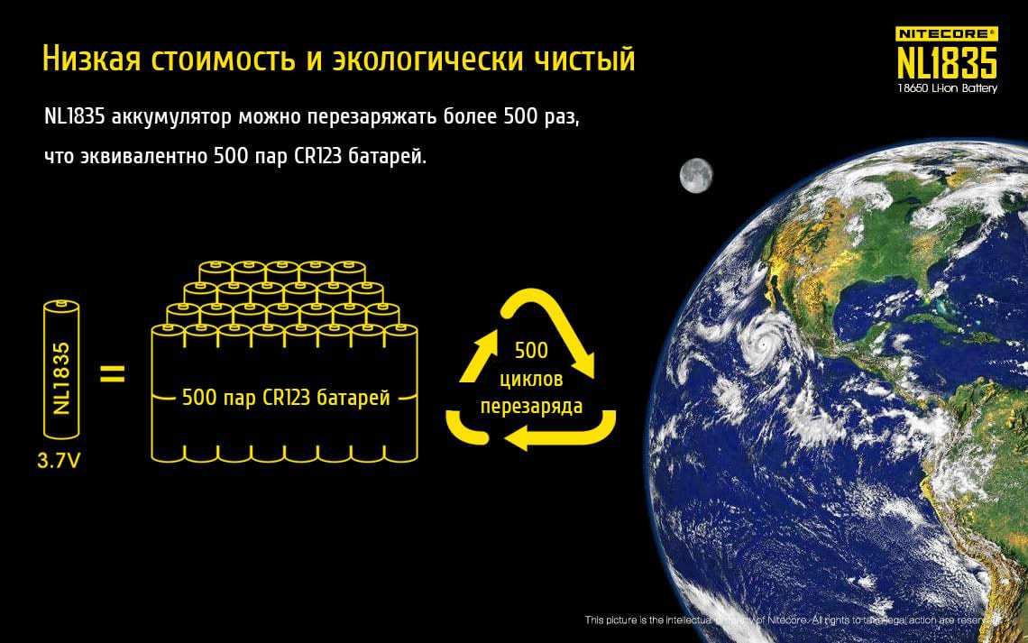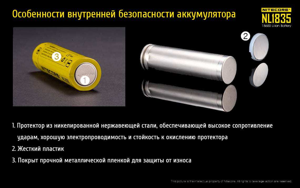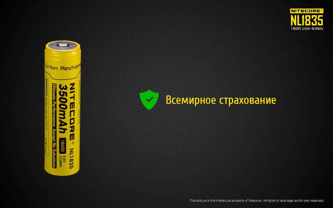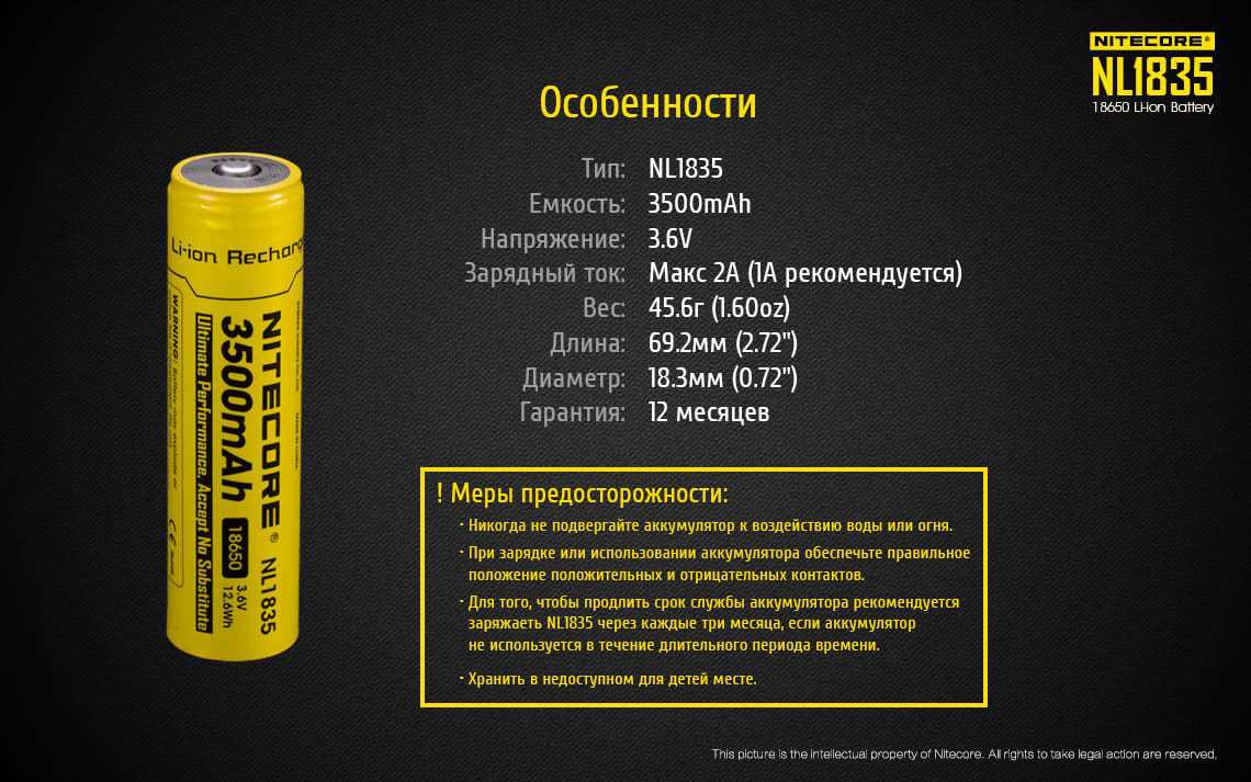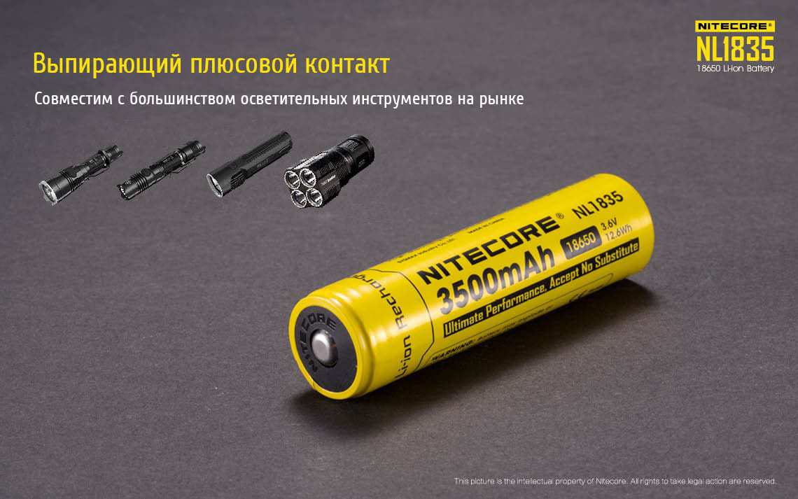 Совершенно новый по ёмкости аккумулятор от компании Nitecore типоразмера 18650, который по мнению экспертов, переведет Li-Ion источники питания на новый уровень — это Nitecore NL1835. Реальная емкость аккумулятора составляет 3500mAh, что на 64% больше, чем у большинства аккумуляторов 18650. Обладая ёмкостью 3500mAh с высоким КПД в сравнении с похожими моделями, аккумулятор является отличным источником для питания многих фонарей, фотоаппаратов, ноутбуков и другого оборудования.