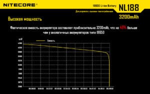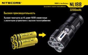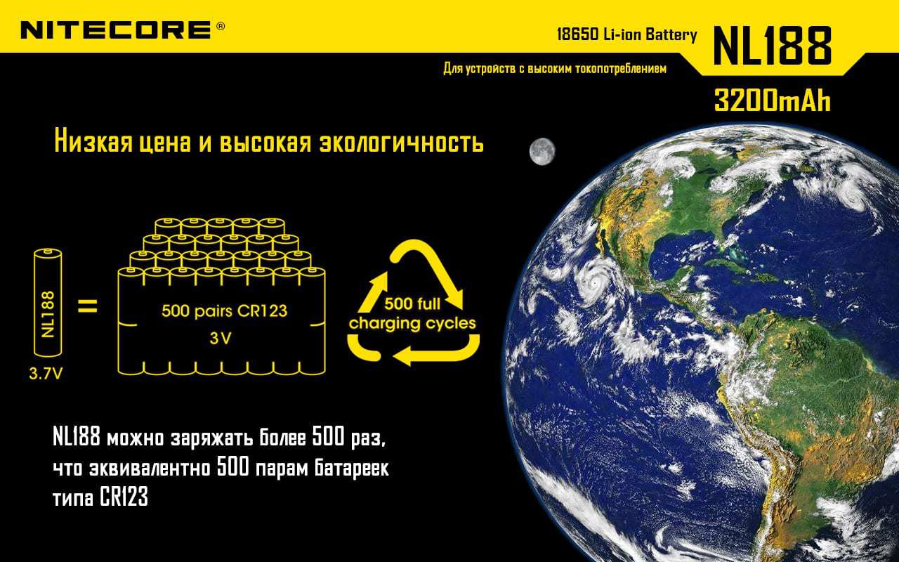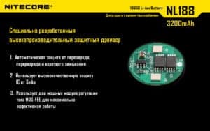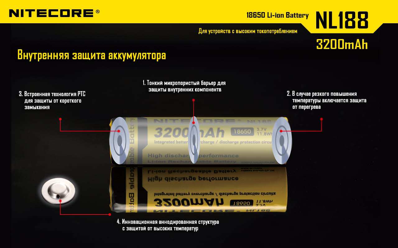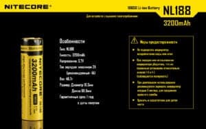 Nitecore NL188 (3200mAh) — качественный литиевый аккумулятор 18650 с начинкой от Panasoniс и качественной встроенной платой защиты от Nitecore. Аккумулятор предназначен для использования в большом количестве устройств как гражданского, так и промышленного назначения. Например, большое количество светодиодных фонарей работают на элементах питания 18650.