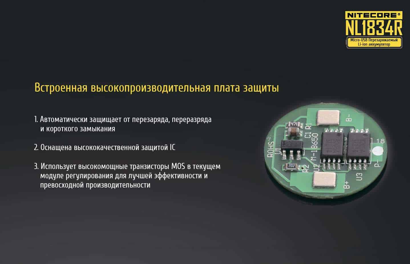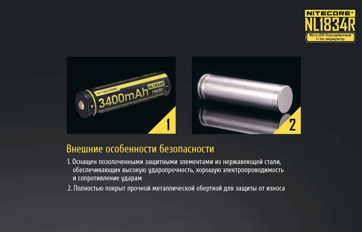 Аккумулятор Nitecore NL1834R имеет ёмкость 3400mAh и стандартные для литиево-ионных аккумуляторов габаритные размеры, что позволяет использовать его в качестве основного элемента питания как для фонарей так и других устройств работающий на данном типе аккумуляторов 18650. Благодаря разработанным специальным защитным свойствам как внутренним так и наружным, при которых элемент питания полностью защищен от непредвиденных ситуаций. В достаточно небольшом габаритном размере представленного аккумулятора имеет встроенная внутренняя защита, которая включает в себя технологию, которая защищает элемент питания от короткого замыкания. Также огромным преимуществом является встроенная плата, которая реагирует на повышение температуры самого аккумулятора, тем самым за счет имеющейся микросхемы снижает выходной ток, для того чтобы снизить температуру корпуса аккумулятора. Для того чтобы предотвратить повреждения внутренних частей представленного аккумулятора, инженеры компании Nitecore предусмотрели во внутренней части размещение микропористого барьера, защищающего внутренние компоненты.
