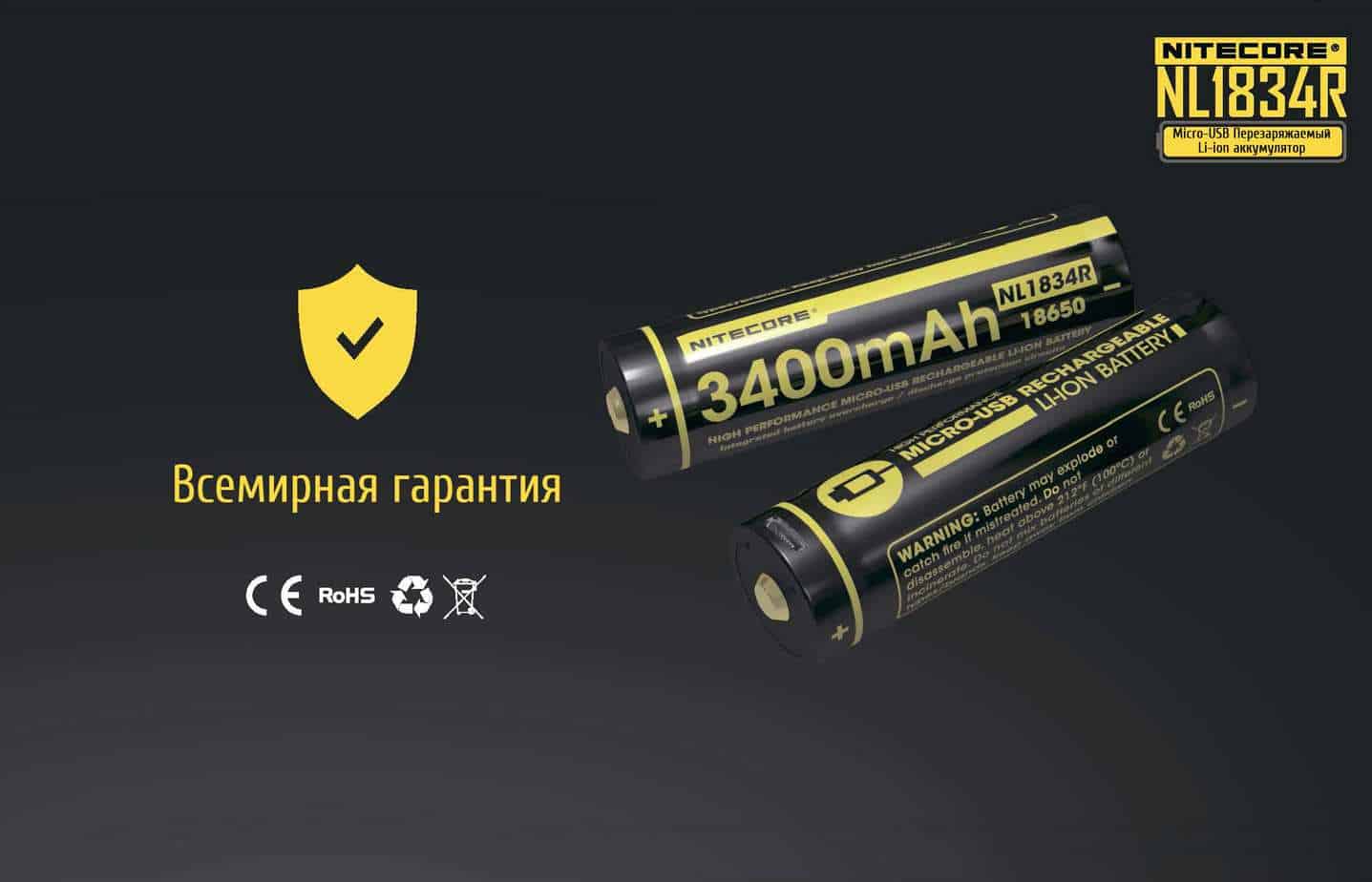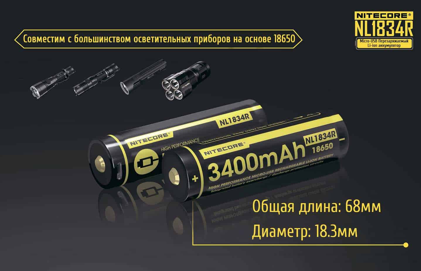NL1834R предусмотрен на 500 полных циклов разряда и заряда, что позволит заменить 500 пар батареек типоразмером CR123, что делает его более экологичным. Также за стандартных габаритных размеров, Nitecore NL1834R является совместимым с большинством осветительных приборов работающих на элементе питания типоразмером 18650.