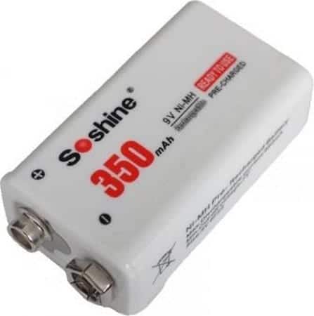 Soshine Ni-MH 350mAh 9V высококачественный и надежный никель-металлогидридные аккумулятор с максимальной емкостью 350мАч. типоразмера крона. Благодаря высокой емкости аккумулятор Soshine Ni-MH 350mAh 9V отлично подойдёт для использования в устройствах, обеспечивая их длительную работу. Незаменим для отпугивателей собак, оборудовании в страйкболе, и миноискателях.