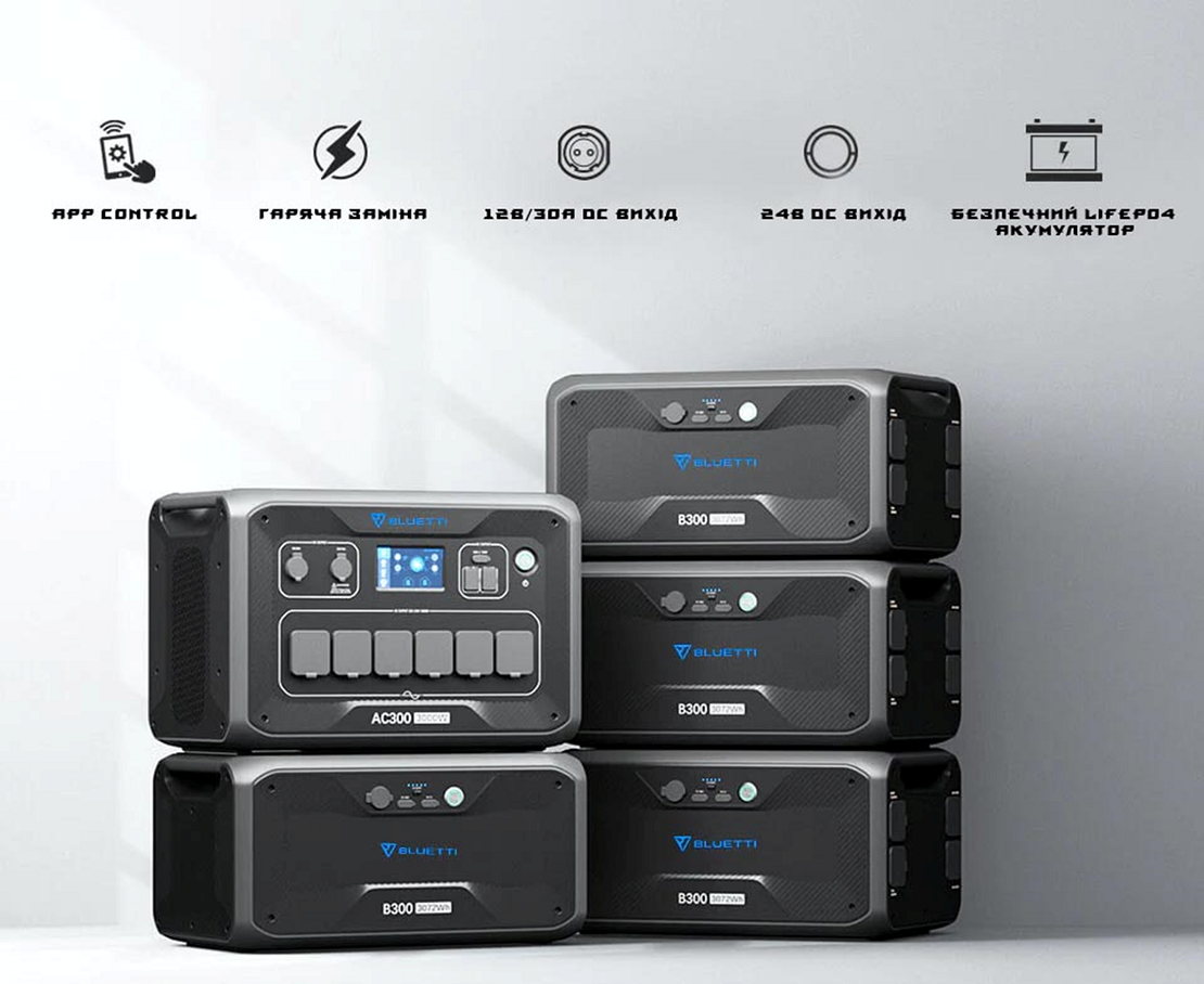 BLUETTI AC300 — портативная зарядная станция, которую можно расширить с помощью четырех батарейных модулей B300 (3072 Вт/ч на блок).