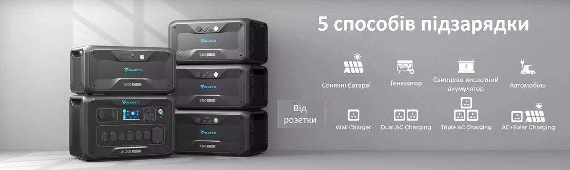 Оборудована мощным инвертором с возможностью контролировать скорость подзарядки от сети. При одновременном подключении к розетке и солнечным панелям можно обеспечить до 5400 Вт. AC300 можно подзарядить от настенной розетки, солнечных панелей, автомобиля, генератора или другого аккумулятора.