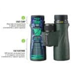 Помимо водонепроницаемости и надежной защиты от ударов, Vanguard VEO ED 8×42 WP защищен от образования внутреннего конденсата, а также от появления царапин оптики и скопления на поверхности линз воды, масел и грязи. Это многопогодный многофункциональный бинокль, который точно не подведет в самых экстремальных условиях. Как и принято в компании Vanguard, качеству аксессуаров бинокля уделили особое внимание: в базовую комплектацию поставляются крышки объективов, которые крепятся к корпусу на поясках, сумка и неопрена для хранения и транспортировки, а также комфортный широкий неопреновый ремень.