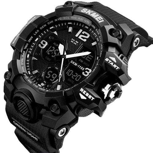 Skmei 1155 Black — это спортивные мужские часы с кварцевым и электронным механизмом и стрелочно-электронным циферблатом. Они идеально подойдут для занятий спортом и активного отдыха. Часы оснащены функциями, такими как будильник, секундомер, второй часовой пояс, дата, год, день недели. Они также имеют полимерное стекло и формат времени 12/24 часа. Корпус часов изготовлен из полимера с чёрным цветом и золотистыми элементами, а диаметр корпуса составляет 55 мм. Ремешок выполнен из каучука черного цвета. Водонепроницаемость часов составляет 50 метров, что позволяет использовать их во время плавания, душа и других водных занятий. Стиль часов — спортивный, а подсветка на циферблате выполнена в электролюминесцентном стиле, что обеспечивает хорошую видимость цифр в темное время суток.