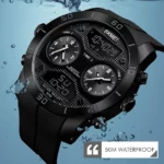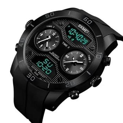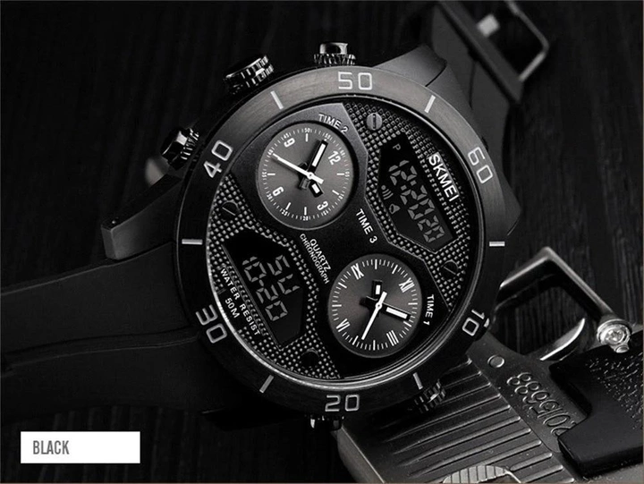 Мощные массивные часы Skmei 1355 настоящий подарок для путешественников. На них есть электронное время для актуального часового пояса и еще два циферблата для того, чтобы знать, сколько времени будет там, куда доставит вас самолет.