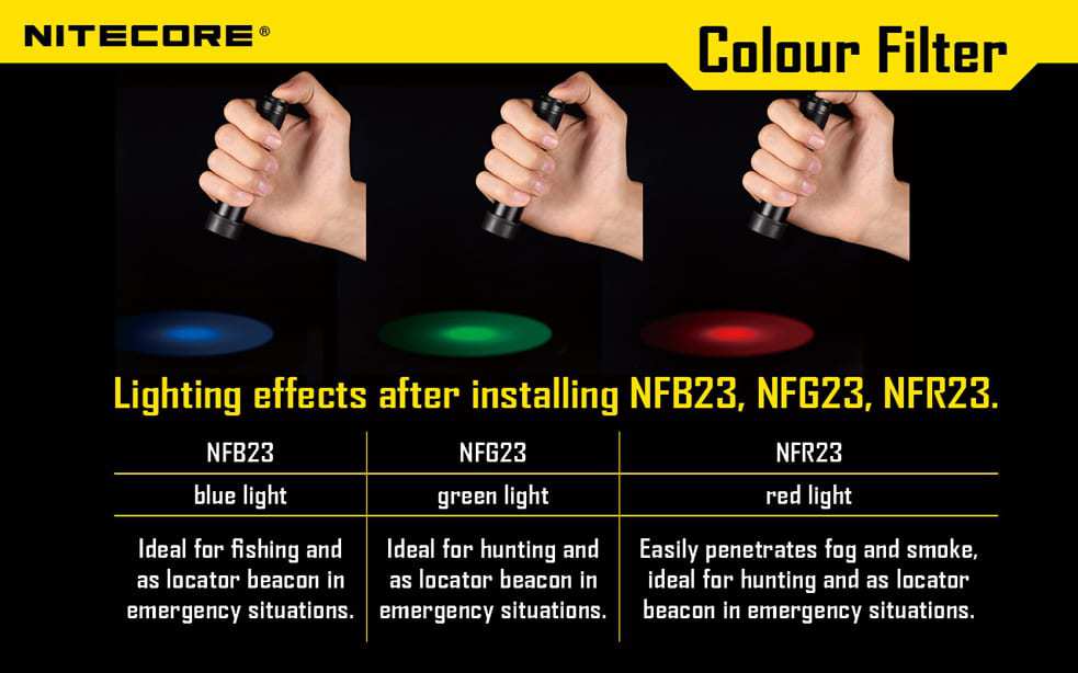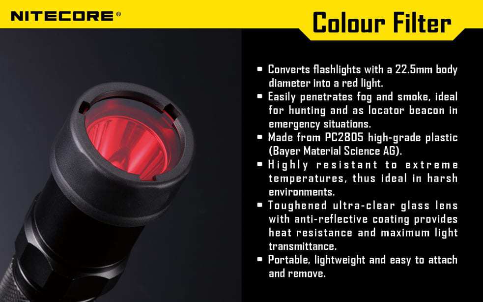 Диффузор-фильтр для фонарей Nitecore NFR23 (22-23 мм) красного цвета применяется как тактическая подсветка приборов, карт (красный свет не ослепляет даже в полной темноте). Часто используется охотниками, пчеловодами, а так же для создания эффектов в фото- и киноиндустрии. Может использоваться для подачи световых сигналов.