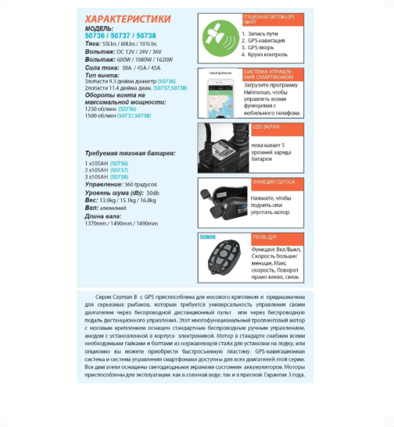 Серия Cayman B  с GPS приспособлена для носового крепления и  предназначена для серьезных рыбаков, которым требуется универсальность управления своим двигателем через беспроводной дистанционный пульт  или через беспроводную педаль дистанционного управления. Этот многофункциональный троллинговый мотор с носовым креплением оснащен стандартным беспроводным ручным управлением, анодом с установленной в корпусе  электроникой. Мотор в стандарте снабжен всеми необходимыми гайками и болтами из нержавеющей стали для установки на лодку, или опционно вы можете приобрести быстросъемную пластину. GPS-навигационная система и система управления смартфонами доступны для всех двигателей этой серии. Все двигатели оснащены светодиодными экранами состояния  аккумуляторов. Моторы приспособлены для эксплуатации  как в соленой воде, так и в пресной. Гарантия 2 года.