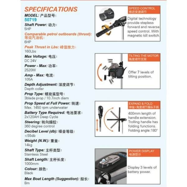 Серия Protruar оснащена бесщеточными двигателями 1.0 / 2.0 / 3.0 л.с. 12V или 4.0 / 5.0 24V и отлично подходит для перемещения большеразмерных лодок и на реках с большим течением. Этот мощный двигатель оснащен микро-ступенчатой регулировкой уровня скорости и чекой безопасности. Мотор можно легко наклонить и вынуть из воды, а высота триммера регулируется с помощью быстрого замка, так что вы можете перемещаться практически на любой глубине. Модели Protruar также оснащены индикатором уровня заряда батареи и могут эксплуатироваться как в соленой, так и в морской воде. Гарантия 3 года.