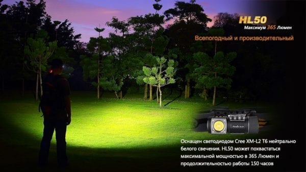 Для налобной модели фонаря Fenix HL50 Cree XM-L2 (Т6) производители выбрали качественый светодиод от известной фирмы из США Cree — Cree XM-L2 (Т6). Это разработанный по последним технологиям полупроводниковый прибор с ресурсом беспрерывной работы 50 000 ч. Он в состоянии в одиночку обеспечить налобному фонарю яркость света до 365 люмен. Дистанция освещения для него составляет 77 м в режиме самой большой яркости. Диод XM-L2 (Т6) производит свет нейтрально-белого оттенка. Для человеческого глаза он наиболее благоприятен, поскольку близок к спектру естественного освещения. Также стоит сказать, что светодиод XM-L2 (Т6) показал на 15-20% большую производительность по сравнению с полупроводниковым прибором прошлого поколения.