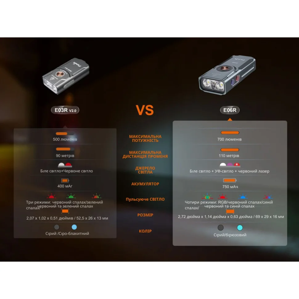 Фонарь Fenix E06R, зарядный кабель USB-C, кольцо на ключи, темляк, инструкция пользователя, гарантийный талон.