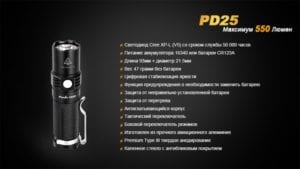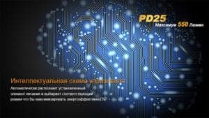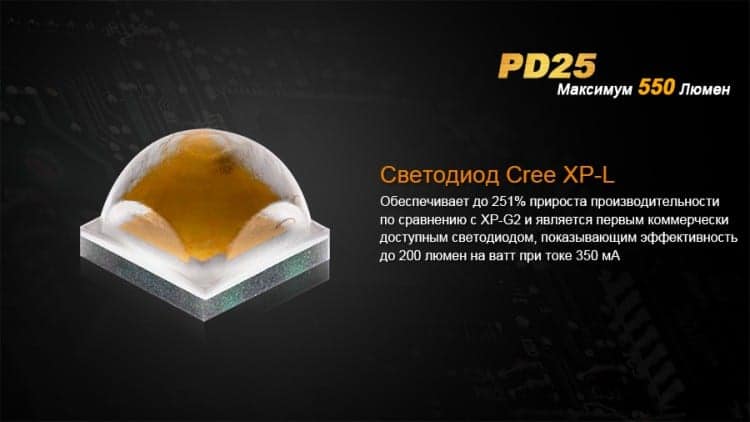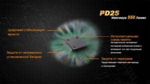 В светосхеме фонаря Fenix PD25 использован современный диод американского происхождения. Это XP-L фирмы Cree — ведущего производителя мощных, долговечных полупроводниковых источников света. Потенциал работы XP-L Cree составляет 50 000 ч. Для поддержания стабильной работы фонаря потребуется всего один аккумулятор формата 16340. Помимо него можно использовать такие же по размеру батарейки CR123A. Рабочие параметры фонаря несколько различаются в зависимости от того, какого типа элемент питания выбрал пользователь. В результате тестирования на заводе Fenix были определены следующие параметры для аккумулятора:
