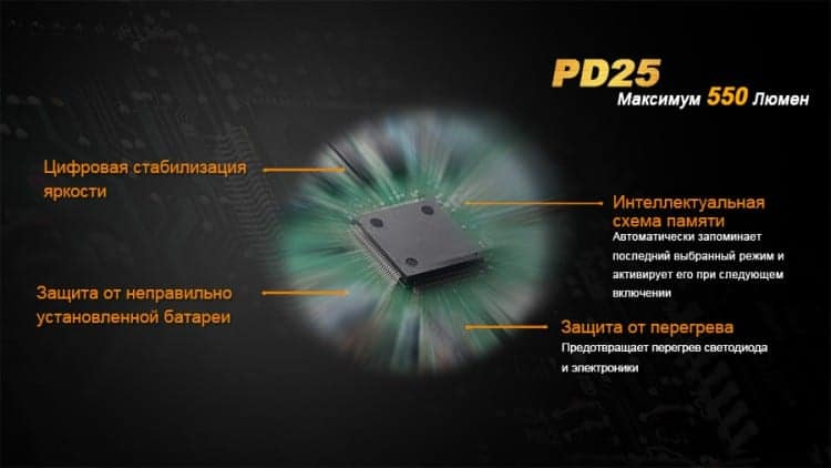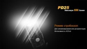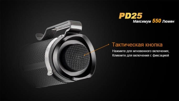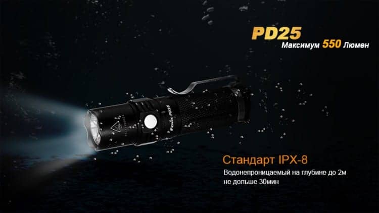 Благодаря небольшим размерам, фонарь Fenix PD25 легко помещается в кармане. А высокий уровень прочности позволяет не беспокоиться о его работоспособности в загородных условиях. Механизмы фонаря защищены от перегрева, возникновения короткого замыкания. Яркость света в выбранном режиме поддерживается специальным драйвером на постоянном уровне, а о том, что заряд аккумулятора исчерпан, предупредит встроенный индикатор. На механическом уровне модель Fenix PD25 также хорошо защищена. Корпус для фонаря сделан из металла с анодированием поверхности, его детали плотно подогнаны друг к другу. Fenix PD25 отвечает требованиям, которые выдвигает международный стандарт IPX-8. Он подразумевает, что фонарь не выйдет из строя после падения с высоты 1 м на камни и продолжит исправно работать после погружения на полчаса на 2 м под воду.