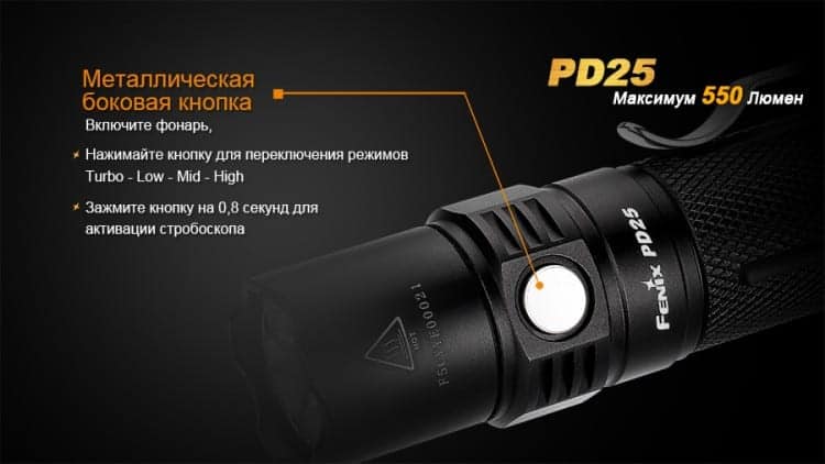 Когда Fenix PD25 включен, короткие клики по боковой кнопке помогут выбрать нужный режим яркости в порядке Turbo-Low-Mid-High. Режим Strobe выбирается более длительным нажатием — 0,8 с.