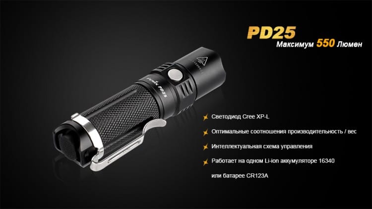 Инструкции по использованию: Fenix PD25 рассчитан на работу с компактными элементами питания двух типов: CR123A батарейки (литиевые), 16340 аккумуляторы (Li-ion). Батарейный отсек сделан под один элемент питания и имеет маркировку, учитывающую полярность батареи.