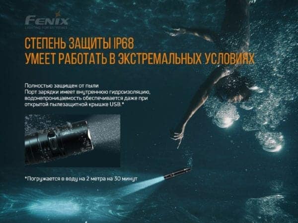 Надежность Fenix PD36R во многом обеспечивает прочный корпус этого фонаря. Материалом для него послужил невосприимчивый к окислению алюминиевый сплав. Оболочка сделана хорошо защищенной от воды. Это качество соответствует наиболее строгому стандарту по международной системе – IP-68, что позволяет включать свет даже под водой (но не глубже 2 м и не дольше, чем на 30 минут). Фонарь продается с темляком, что дает дополнительную страховку от его случайного падения во время использования, и с чехлом, который защищает его от грязи.