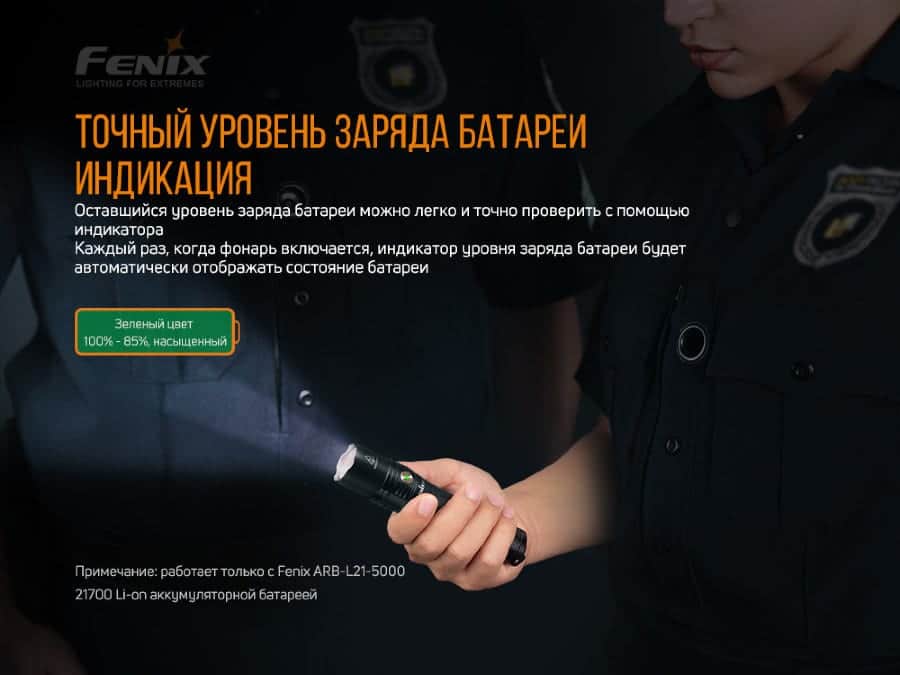 При каждом включении света срабатывает индикатор заряда. Эта функция дает возможность свободно ориентироваться в том, сколько еще времени остается для использования фонаря Fenix PD36R в разных режимах яркости до разрядки. Если включается зеленая лампочка, которая равномерно светится, заряда осталось 100%-75%. Если эта лампочка мигает, то уровень заряда составляет 75%-50%. В случае включения красной лампочки, которая равномерно светится, уровень заряда равен 50%-25%. Если красная лампочка только мигает, уровень заряда ниже 25% и аккумулятор пора подключить на зарядку. Время зарядки полностью разряженного элемента питания составляет 4 ч.