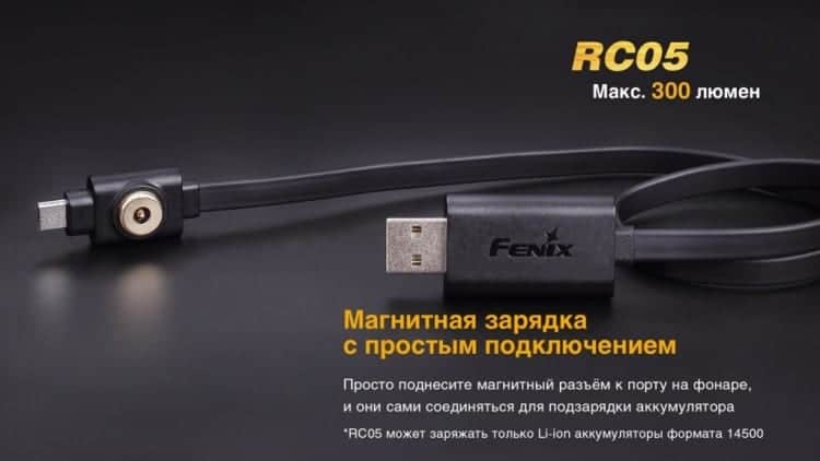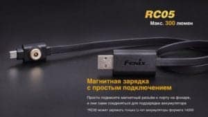 Для поддержания работы RC05 потребуется всего один аккумулятор размера 14500. Если выбрать фирменный элемент питания Fenix на 800 мАч, то его энергии хватит до 40 часов. Также подойдет обычная пальчиковая батарейка (АА). Но производители предупреждают, что режим Turbo доступен только при использовании аккумулятора. Кроме того, в этом режиме фонарь довольно сильно нагревается, и чтобы избежать связанных с этим неисправностей, режим Turbo отключается после 5 минут работы, чтобы фонарик мог немного остыть. После разрядки аккумулятора, его можно заменить новым либ зарядить. В комплекте с фонариком есть специальный кабель, позволяющий зарядить элемент питания 14500 прямо в корпусе фонаря.