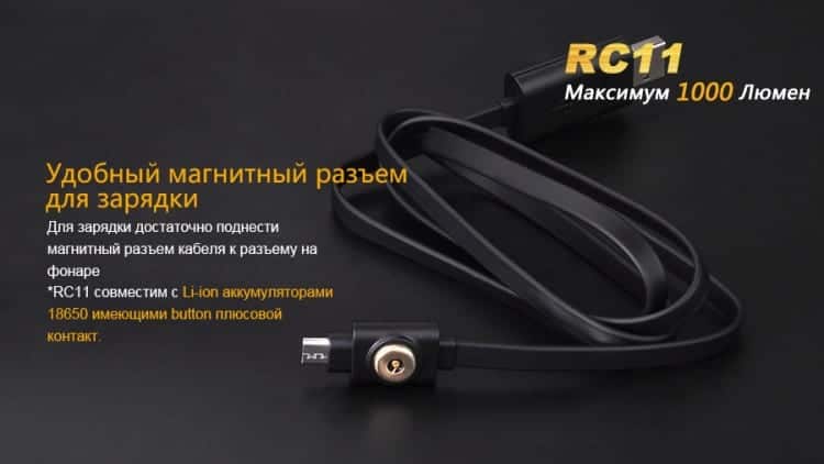 Fenix RC11 — удобный фонарик ручного формата. Он небольшой по размеру и весит только 70 граммов. Работает данная модель на одном литий-ионном аккумуляторе 18650. Один такой элемент питания, рассчитанный на 2600 мАч емкости, изначально включен в комплект поставки. Он может повторно заряжаться до 500 циклов, не теряя емкости в существенных пределах. Для работы фонаря Fenix RC11 его заряда хватит от 1 ч 20 мин в турборежиме, до 135 люмен в режиме Eco. Но пользователь также может установить в аккумуляторное отделение две батарейки CR123А.