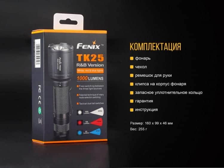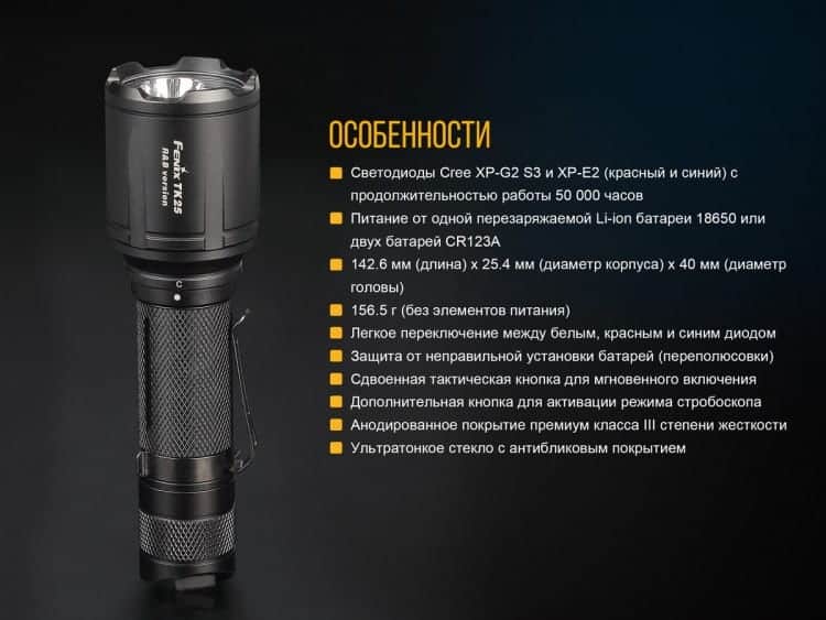Если перед вами стоит задача выбрать качественный ручной фонарь, пригодный для использования на рыбалке, охоте и в поездках на природу для отдыха, то достойным выбором станет модельFenix TK25RB. Этот фонарь оснащен двумя долговечными светодиодами, произведенными компанией Cree. Их основная черта — долговечность, поскольку прослужит каждый из диодов больше 50 тысяч часов. Помимо того, данные источники света очень экономично потребляют энергию батарей, что позволяет фонарю проработать дольше без необходимости установки нового элемента питания.