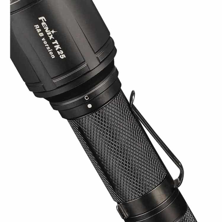 В поддержку тактических качеств TK25RB, производители снабдили фонарь очень прочным корпусом, сделанным из анодированного алюминия. Такая оболочка защитит все размещенные внутри механизмы от повреждений даже при падении на камни с метровой высоты. Кроме того, фонарь сделан полностью водонепроницаемым. Модель Fenix TK25RB в состоянии работать с дополнительно приобретенными аксессуарами, среди которых выносная тактическая кнопка, различные светофильтры и крепления. Поэтому его немалую функциональность можно еще больше расширить за их счет.