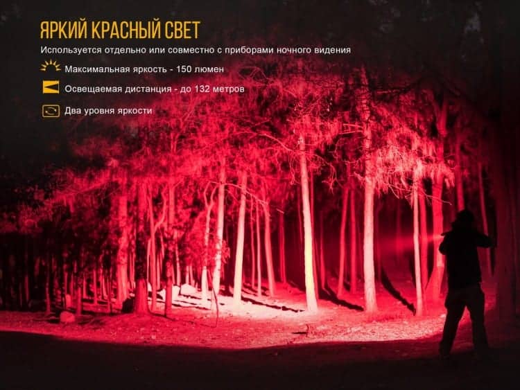 Самая большая яркость, доступная владельцам TK25RB, составляет 1000 люмен. Это яркость режима постоянного света Turbo и стробоскопа. Дальность освещения при такой яркости составляет 225 метров. Можно использовать и еще 3 уровня яркости белого света: 15 люмен (с радиусом освещения 25 метров), 100 люмен (с радиусом освещения 75 метров), 300 люмен (с радиусом освещения 124 метра). Однако белый свет — не единственный вариант, возможный для данной модели. Второй диод фонаря работает еще в трех режимах красного и синего света. На красный приходится два из режимов (150 люмен и 25 люмен), а на синий — один (60 люмен).