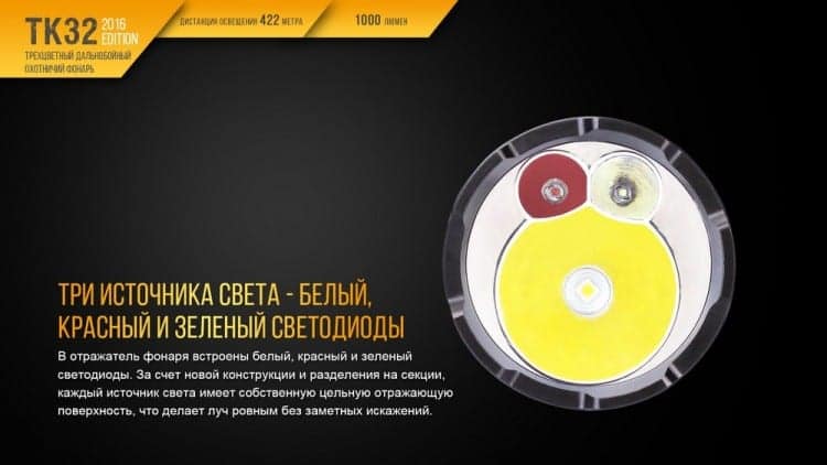 Широкому применению TK32 2016 способствует и то, что в него интегрированы три диода Cree, каждый из которых дает луч своего цвета: белый, красный и зеленый. Это очень долговечные модели диодов, потенциал которых насчитывает 50 тысяч часов освещения. Благодаря ним, фонарь поддерживает восемь различных режимов. Они разделены на две группы: основное освещение и дополнительное цветное. Ниже представлены основные рабочие параметры всех этих режимов.