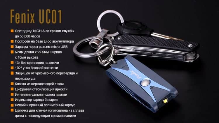 Комплектация: фонарь Fenix UC01, цепочка, инструкция, гарантийный талон