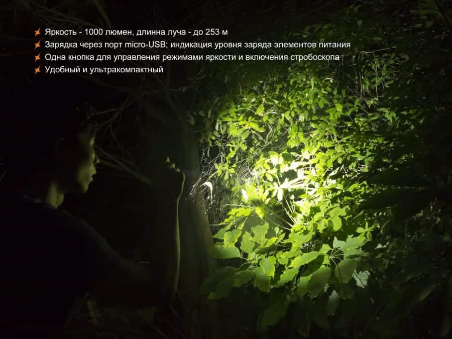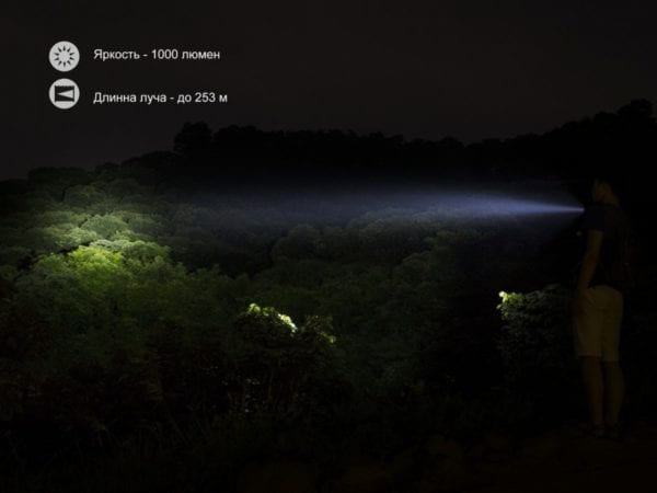 • Turbo: яркость на отметке 1000 люмен, интенсивность света — 16 000 кд, дальность луча — 253 м, суммарное время работы — 1 ч 25 мин;