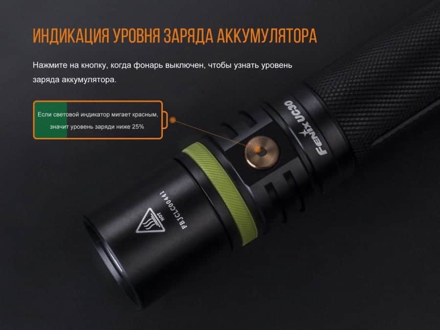 Модель Fenix UC302017 работает со стандартным аккумулятором литий-ионного типа размера 18650. Поэтому при желании комплектный аккумулятор можно заменить более емким или же брать с собою на природу запасной элемент питания. Кроме того для этого фонаря предусмотрена возможность подзарядки аккумулятора через кабель формата micro-USB от внешнего источника питания. В фонарь встроен индикатор, определяющий уровень заряда. Если аккумулятор полон, кнопка управления фонарем будет гореть зеленым. Когда зеленый свет начнет мигать, значит уровень заряда снизился до 50-85%. При остатке заряда 25-50% кнопка будет равномерно светиться красным, а если красный станет мигать, то заряда уже менее 25%. Также возможно использование одноразовых батареек, формат которых — CR123A.