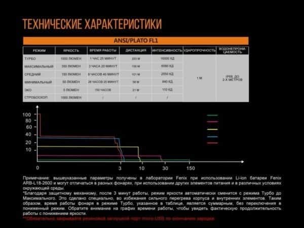 • Eco: яркость — 5 люмен, интенсивность света — 110 кд, дальность луча — 21 м, общее время работы — 150 ч;