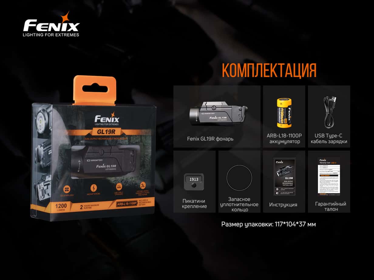 Фонарь модели Fenix GL19R, литий-ионный аккумулятор Fenix ARB-L18-1100p, кабель для зарядки USB Type-C, планка Пикатинни, запасное уплотнительное кольцо, руководство к применению, талон гарантии.