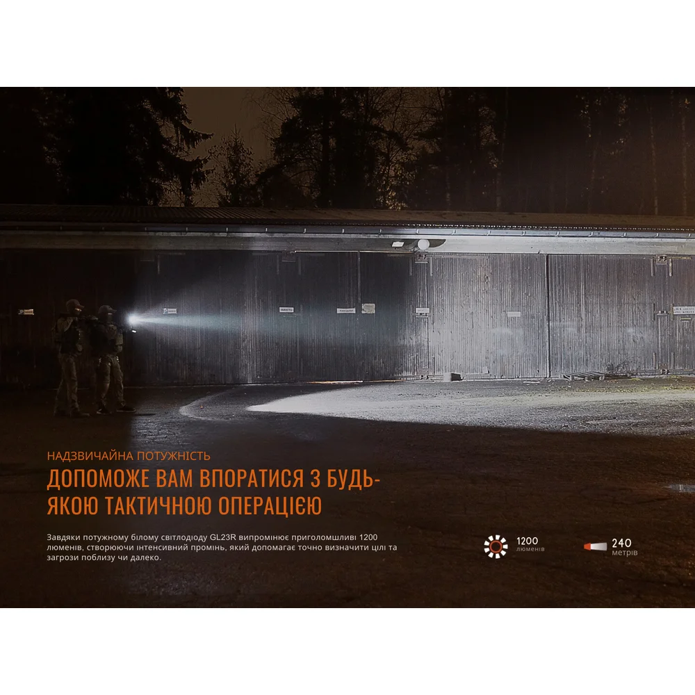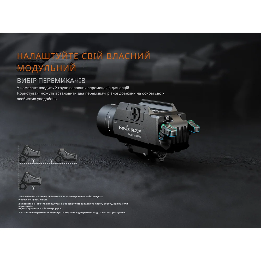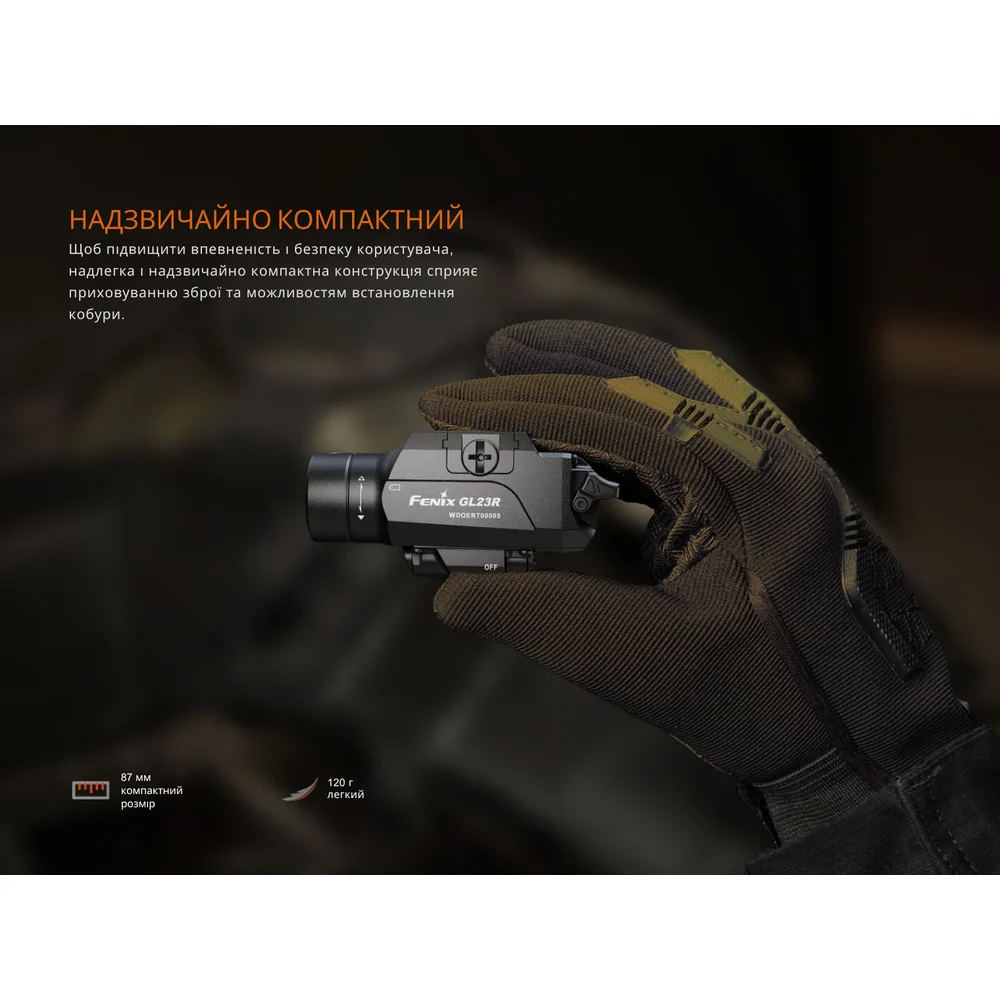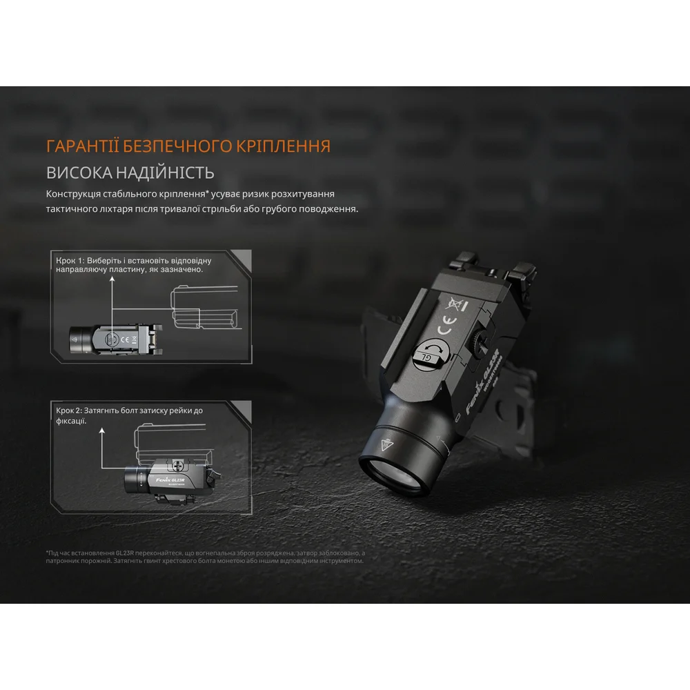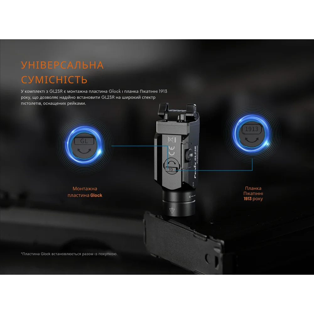 Пистолетный фонарь Fenix GL23R – это универсальная модель, которую можно использовать для подсветки отдельных объектов и точного прицеливания при выполнении служебных и тактических задач. Фонарь подходит для установки на большинство полноразмерных пистолетов с планкой GLOCK® или MIL-STD-1913 (Пикатинни). Для этого в комплектации предусмотрены соответствующие крепления.