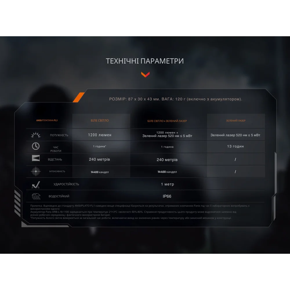 - Комбинированный (белый свет + зеленый лазер): 1200 лм + 520 нм ≤ 5 мВ – 14400 кд – 1 час – 240 м.