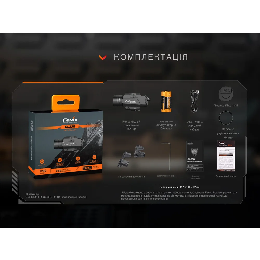 Фонарь Fenix GL23R, аккумулятор ARB-L18-1100 и зарядный кабель USB Type-C, 4 сменные переключатели, запасное уплотнительное кольцо, крепление на планку Пикатинни и Glock, шестигранный ключ, инструкция пользователя, гарантийный талон.