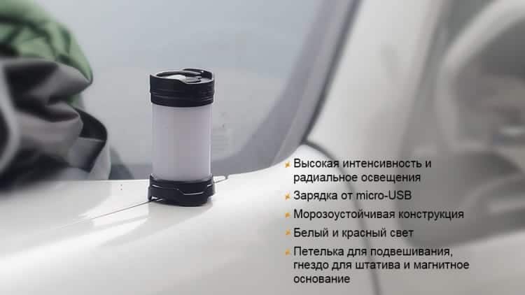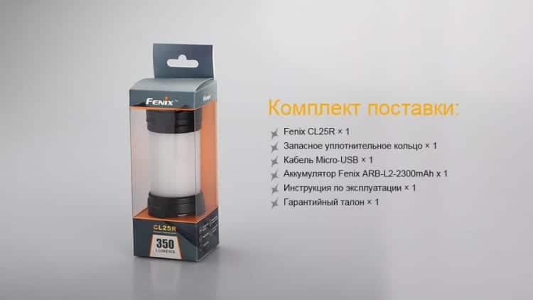 Комплектация: Кемпинговый фонарь, фирменный аккумулятор 18650 емкостью 2300 мАч Fenix ARB-L2, кабель для порта micro-USB, запасной резиновый уплотнитель для стыков корпуса.