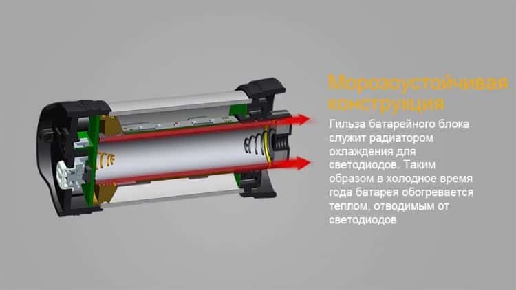 - возможность работы от аккумулятора 18650 или двух батарей CR123A;