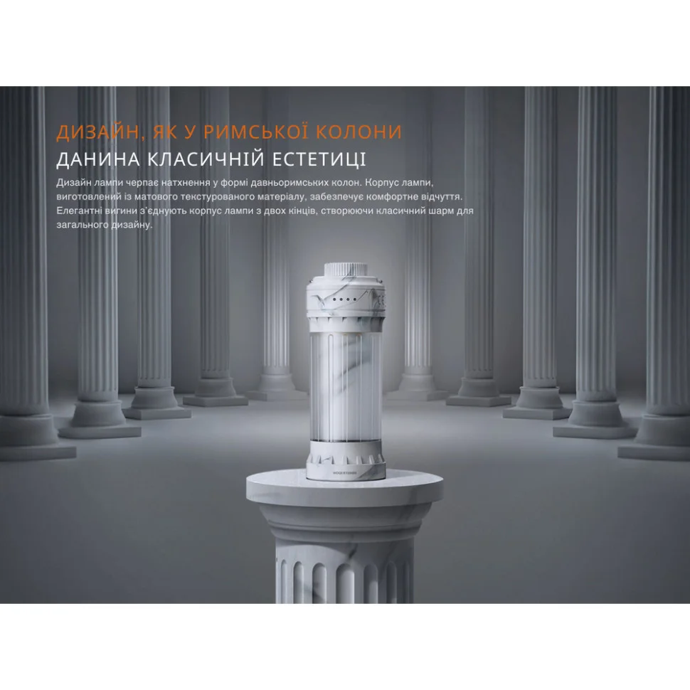 Широкий набор из 12 режимов яркостью до 500 лм и длительное время работы на одном заряде (до 200 ч) делают Fenix CL22R актуальным выбором не только для кемпинга и туристических путешествий. Фонарь также можно использовать в домашних условиях при отключении электроэнергии, тогда как стильный корпус с дизайном, напоминающий римскую колонну, станет украшением любого интерьера.