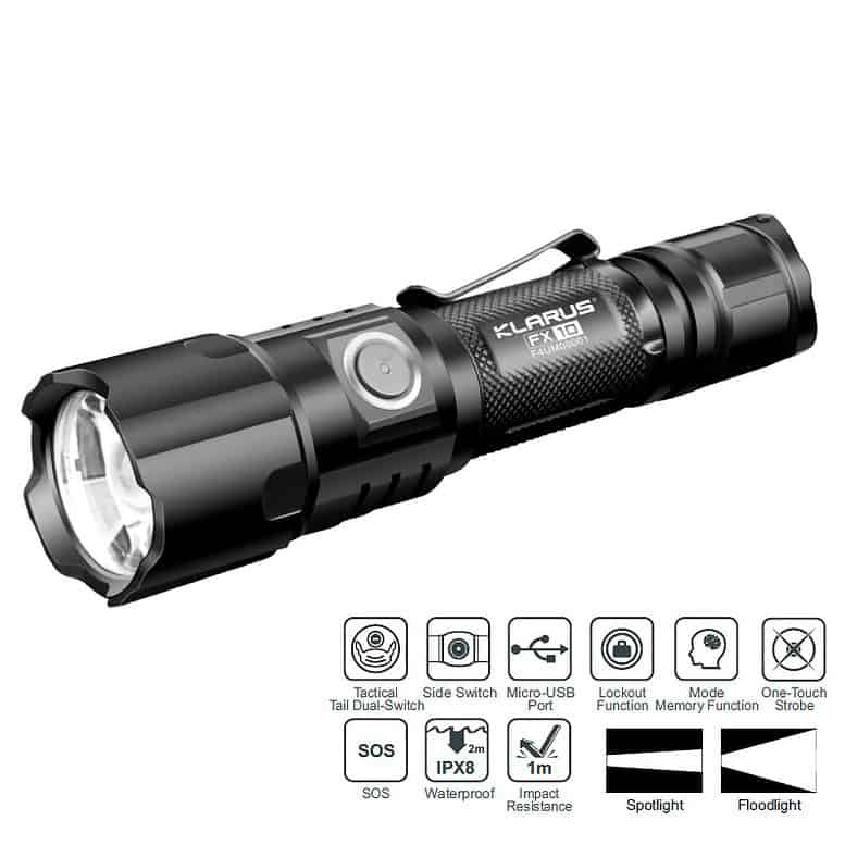 Klarus Focusing System (KFS) — запатентованная оптическая линза нового поколения с эргономичным настройкой фокусировки / увеличения, легко меняет выходной сигнал прожектора; равномерное и мягкий световой поток ослепит пользователей. • Поликарбонатные линзы оптического качества, превосходное пропускание света, длительный срок службы, устойчивость к окислению, высокой температуре и ультрафиолетовому излучению.