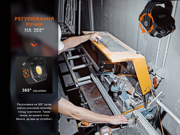 Во взвешенном за рукоятку положении фонарь позволяет регулировать угол освещения на 360°, подстраиваясь под потребности пользователя.