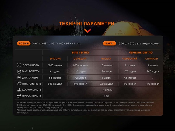 • Максимальный : 2000 люмен – 58 метров – 9 часов;