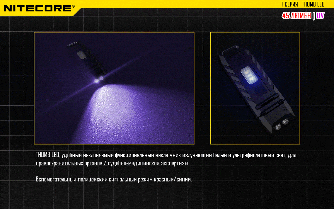 Nitecore THUMB LEO — это модификация ранее уже ставшего популярным тактического фонаря THUMB. Фонарь не имеет основательных отличий в дизайне, но оборудован уникальной внутренней «начинкой». Данная модель имеет два разных светодиода, один из которых излучает мощный световой поток в 45 люмен, а второй ультрафиолетовый свет. Головная часть обладает градусом поворота в 120 единиц. Что довольно комфортно позволит расположиться фонарю в руке, и достаточно практично при повороте большим пальцем. При очень низкой энергозатратности фонарь способен проработать до 48 часов. Получает энергию фонарь от встроенного литиево-ионного аккумулятора на 220mAh. Интеллектуальная плата для защиты предохраняет аккумулятор от переразряда, перезаряда, от короткого замыкания и автоматически завершает зарядку при достижении 100% ёмкости аккумулятора. Также предусмотрены два разных светодиода зеленого и красного света, которые уведомляют Вас о статусе заряда. Корпус выполнен из поликарбонатного материала, который обладает высокой эластичностью и прочностью. Материал широко применяется в электронике, страйкболе и т.д. Универсальная клипса из стали даёт возможность закрепить фонарь на рюкзаке (благодаря своей поворотной голове), на кепке или на кармане. Кольцо для подвески на ключиможет выдержать вес до 35 кг на разрыв.