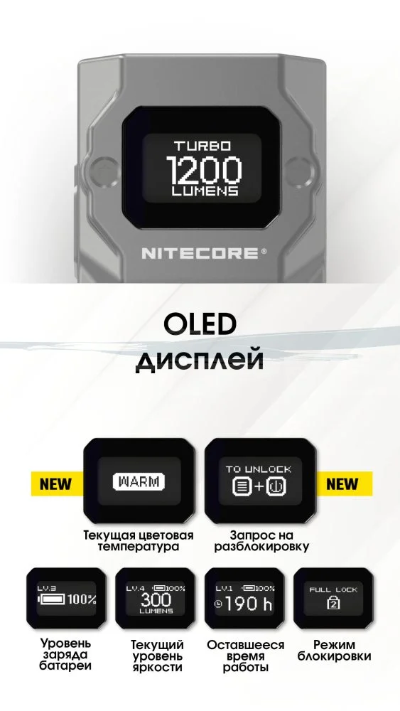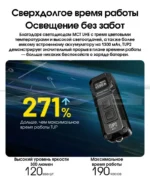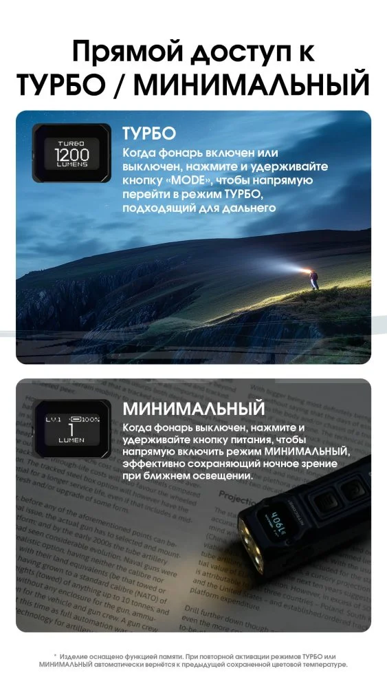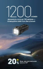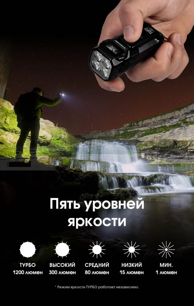 - Режимы работы: Турбо — 1200 люмен, Высокий — 300 люмен — 2 часа, Средний — 80 люмен — 7 часов 15 минут, Низкий — 15 люмен — 30 часов, Минимальный — 1 люмен — 190 часов