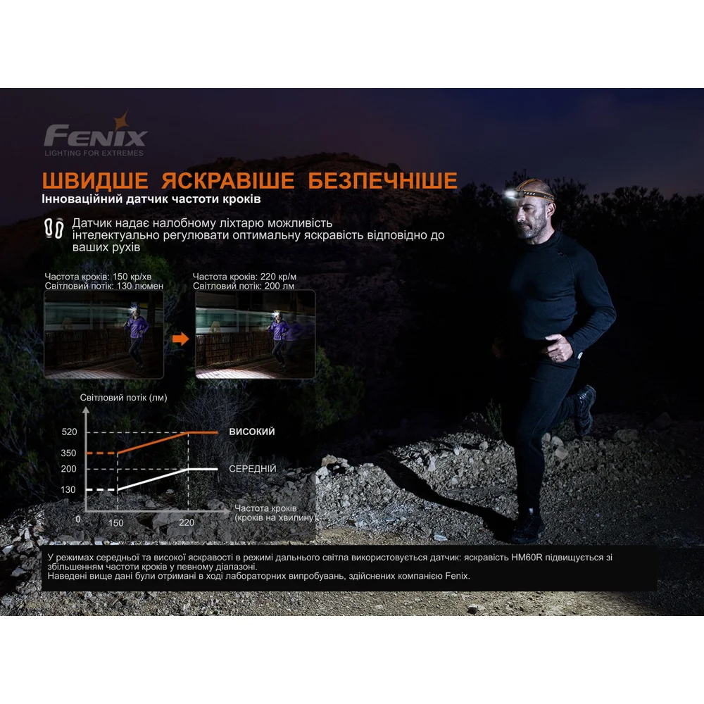Уникальной фишкой модели является интеллектуальный сенсор частоты шага . Фонарь автоматически регулирует яркость в зависимости от темпа движения в «Среднем» и «Максимальном» режимах. За стандарт взят темп 150 шагов/мин: при ускорении до 220 кр/мин яркость возрастает до 150% , а при замедлении до 80 кр/мин – снижается до 70% . Если темп падает, яркость постепенно уменьшается с задержкой в 10 секунд, что позволяет глазам адаптироваться к изменению света.