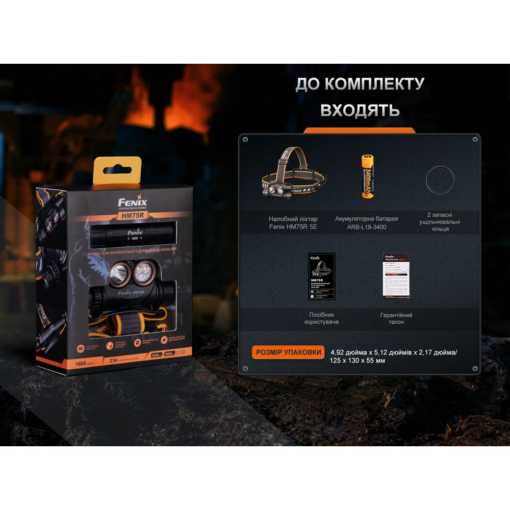 Фонарь Fenix HM75R с налобной крепью, li-ion аккумулятор ARB-L18-3400, зарядный кабель USB Type-C, запасное уплотнительное кольцо, гарантийный талон, инструкция пользователя.