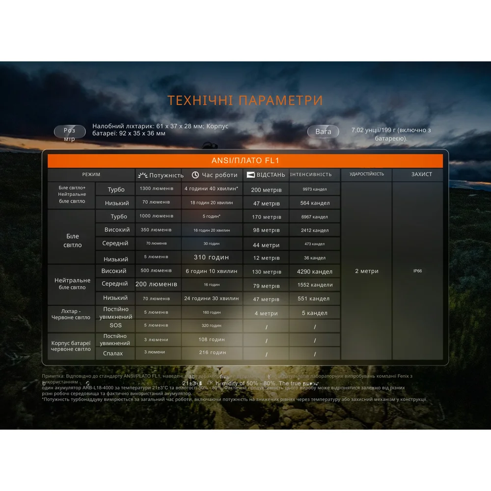 • Турбо: 1300 лм – 9973 кд – 4 часа 40 мин – 200 м;