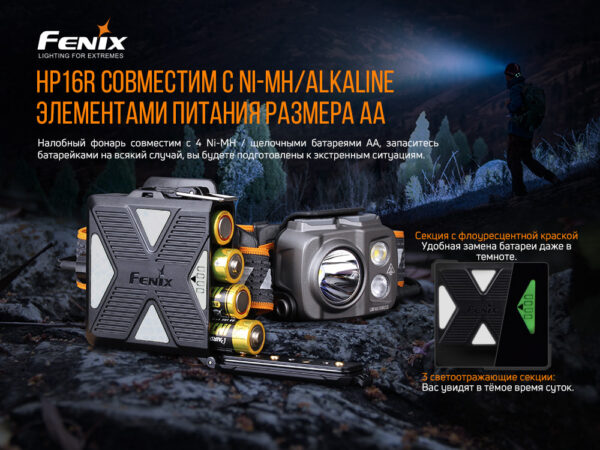 Налобный фонарь Fenix HP16R представляет собой перезаряжаемую высокопроизводительную модель. Он обеспечивает пользователю яркость в 1700 люменов, а дальнобойность достигает 260 метров. Фонарь может работать в течение 300 часов в Минимальном режиме. Есть отдельный батарейный отсек, питание происходит от литий-полимерного аккумулятора Fenix ARB-LP3000.